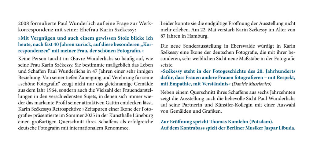 Viele Arbeiten entstanden auch in enger Werkkorrespondenz mit Paul Wunderlich. Für ihn war sie immer „Die schöne Fotografin“, die er in unzähligen seiner Bilder dargestellt hat. Insofern bleibt Karin Székessy auch durch sein Werk in unseren Herzen und in unserem Blick.